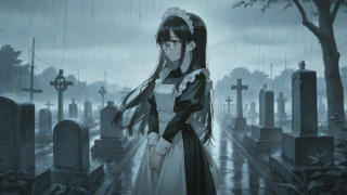 PixAI【Shiitake-Mix】monochrome,girl,black hair,long hair,straight hair,maid,glasses,cowboy shot,cemetery,rain,looking aw...