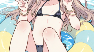 PixAI【Shiitake-Mix】the anime girl sits on top in the water on the floatie, 1girl,loli, anklet,bracelet, swimsuit, solo,...