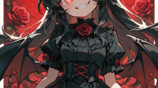 PixAI【Shiitake-Mix】1girl, litre girl, solo, black hair, long hair, cat ears, red eyes, cowboy shot, devil wings, gothic...