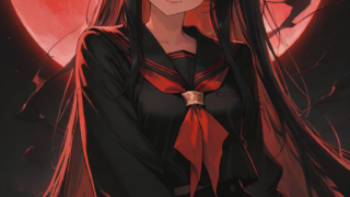 PixAI【Shiitake-Mix】girl,long hair,black hair,straight hair,blunt bangs,black serafuku,Long sleeve,long skirt,red ey...