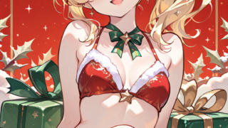 PixAI【Shiitake-Mix】girl,blonde hair,green eyes,side ponytail, santa bikini,green ribbon,no hat,holly hair ornament, loo...
