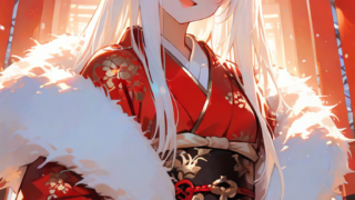 PixAI【Shiitake-Mix】1girl, fox girl, white hair, red eyes, long hair, straight hair, blunt bangs, red kimono, gold embro...