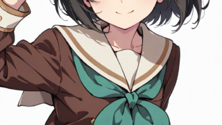PixAI【Shiitake-Mix】ahagon umiko(new game),green eyes, jitome,long hair, dark skin, x hair clip,brown hair, Black t-shir...