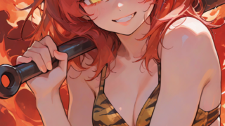 PixAI【Shiitake-Mix】girl,oni, oni horns,solo,TIGER bikini,red hair,messy hair,yellow eyes, medium hair, slav squatting, ...
