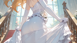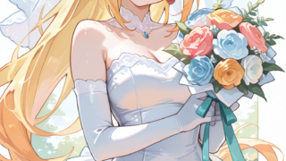 PixAI【Shiitake-Mix】darkness(konosuba),ponytail, looking at viewer,wedding dress,long skirt, elbow gloves, smile...