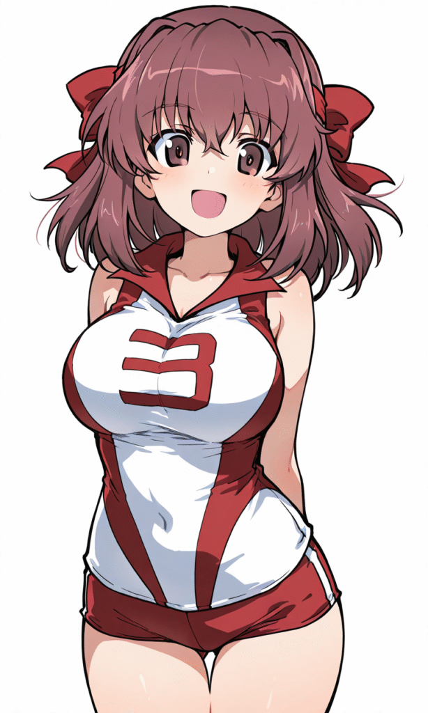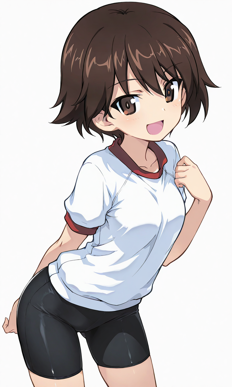 PixAI【Shiitake-Mix】1girl, isobe noriko (girls und panzer), smile, open mouth, gym uniform, bike shorts, cowboy shot, simple background, white background, masterpiece, high quality, tokiame