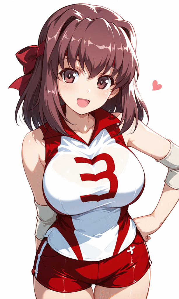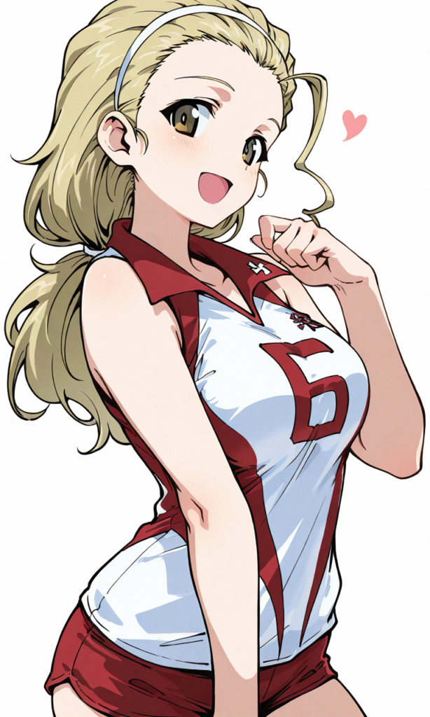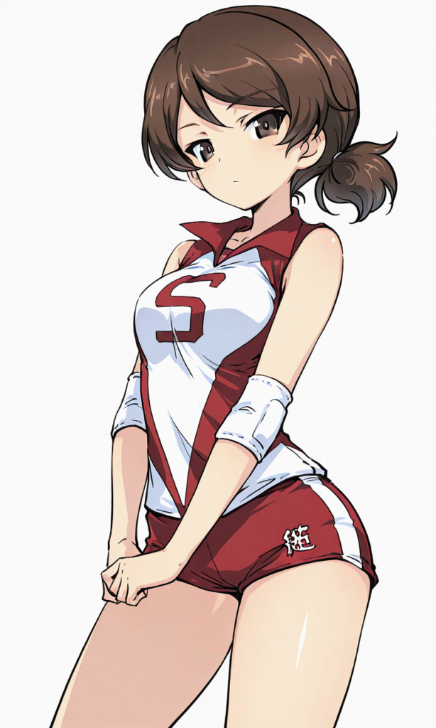 【Haruka v2】kondou taeko(GIRLS und PANZER), smile, open mouth, elbow supporter, red shorts, cowboy shot, simple background, white background, masterpiece, high quality, tokiame