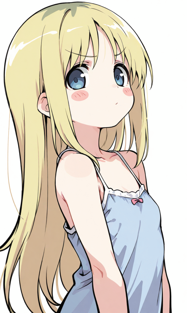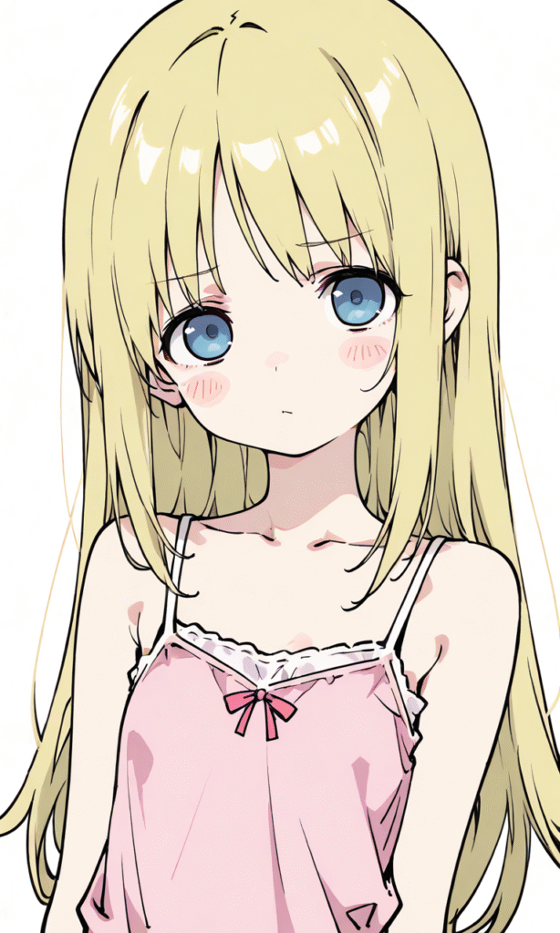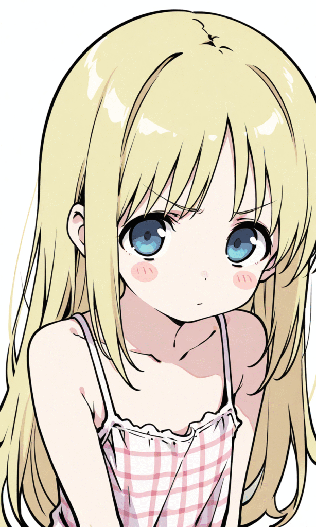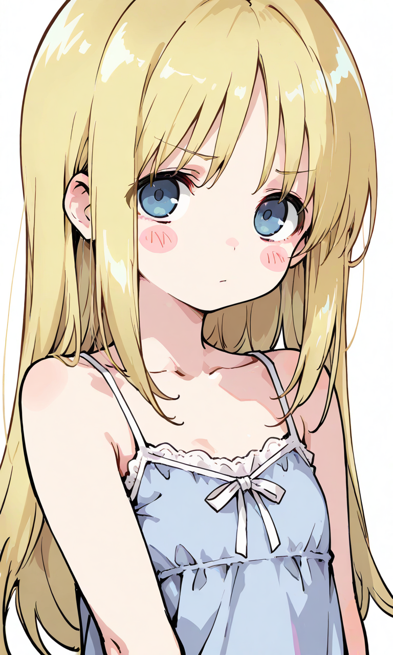ana coppola, little girl,solo,straight hair, >:(,blush stickers,camisole,upper body, simplebackground,white background, masterpiece,high quality, flat color style, simple coloring style,tokiame,748cmstyle