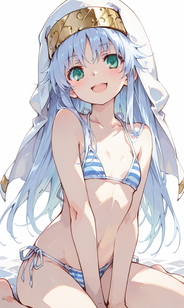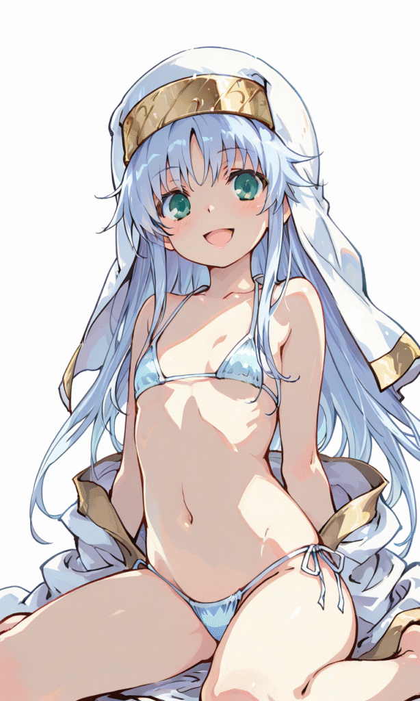 1girl, index (toaru majutsu no index), looking at viewer, microbikini, flat chest, wariza, smile, open mouth, cowboy shot, simple background, white background, masterpiece, high quality, high resolution, tokiame, 748cmstyle, fantasy scene