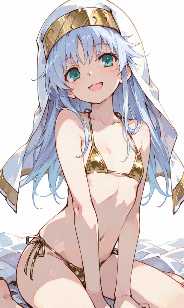 index (toaru majutsu no index), looking at viewer, gold microbikini, flat chest, wariza, smile, open mouth, soft lighting, cowboy shot, simple background, white background, masterpiece, high quality, high resolution, tokiame, 748cmstyle, fantasy scene