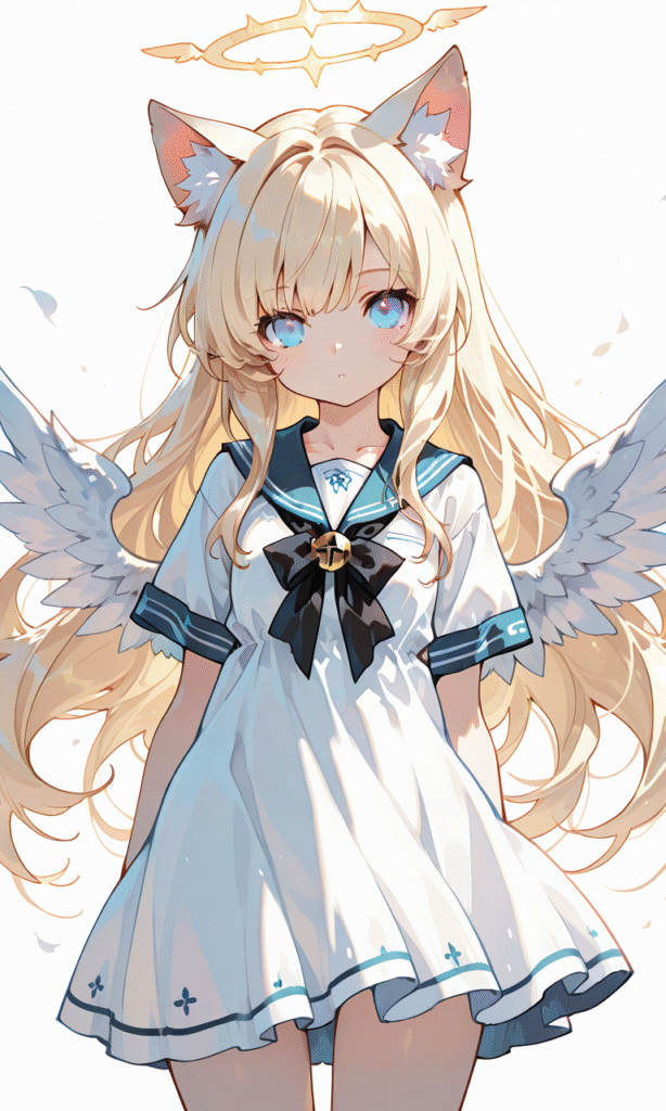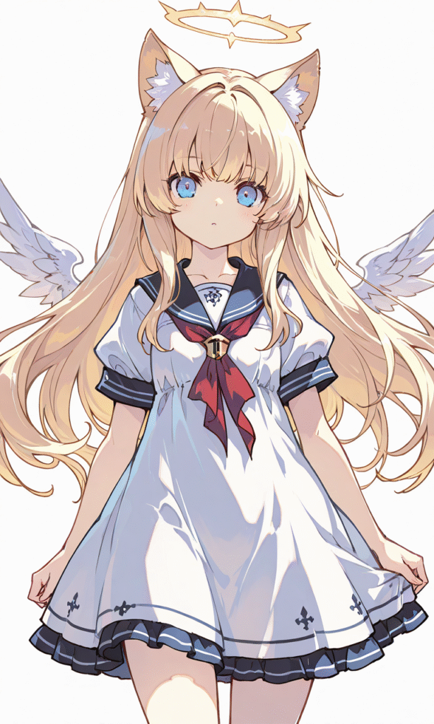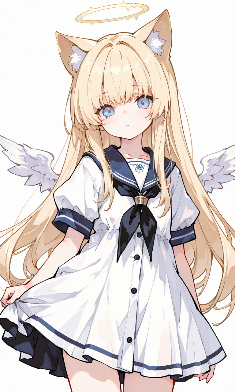 PixAI【Shiitake-Mix】1girl, , blonde hair, long hair, cat ears, looking at viewer, cowboy shot, halo, little wings, masterpiece, simple background, white background, high quality, sailor dress, short sleeves,tokiame,748cmstyle