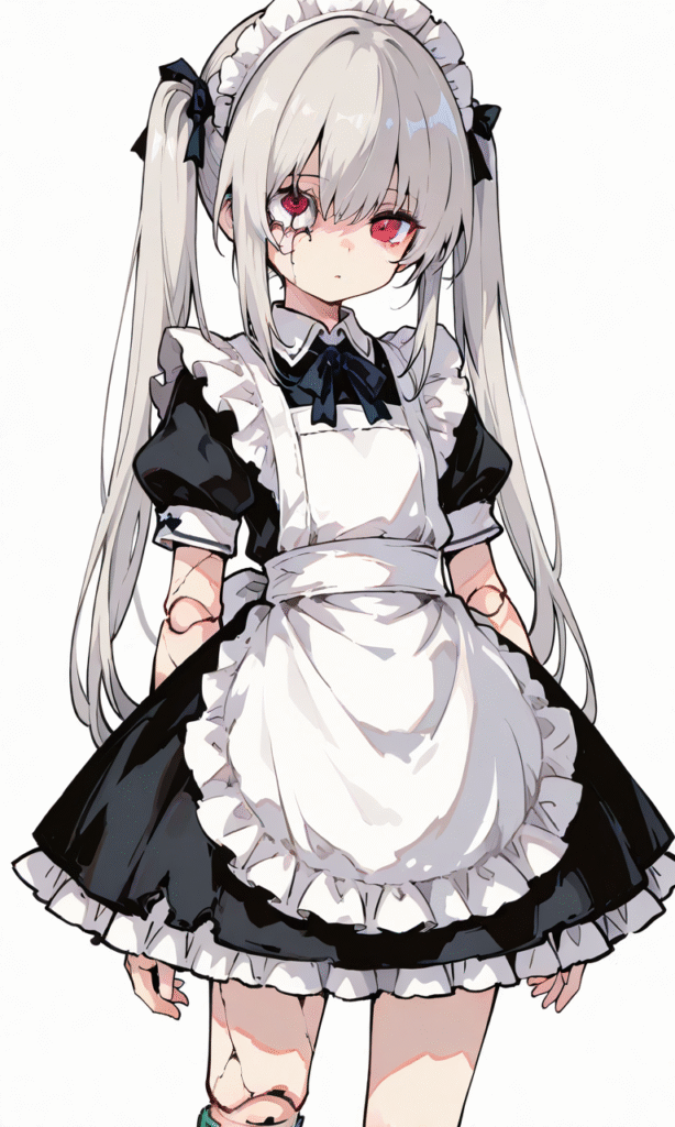 doll joints,loli,Broken eye, red eye,long hair, solo, silver hair,twintails,damaged arms,damaged leg,maid,short sleeves, simplebackground,white background,cowboy shot,masterpiece,high quality,tokiame,748cmstyle