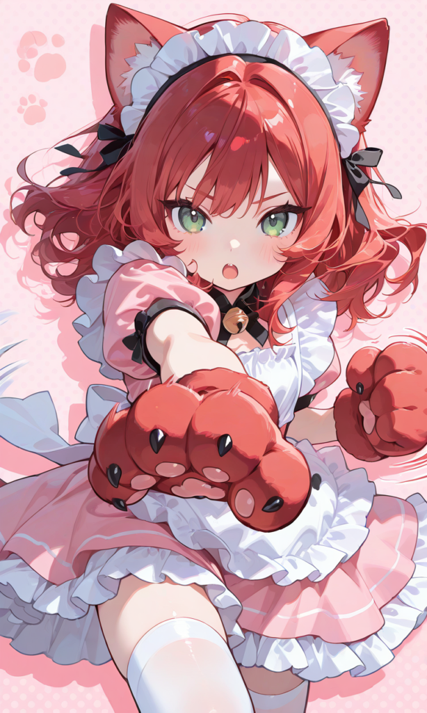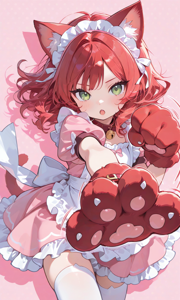 PixAI【Shiitake-Mix】little girl,loli,red hair, medium hair, wavy hair, green eyes, tsurime,cat eyes, pink maid,puffy short sleeves, cat ears hairband,white thighhighs,open mouth,punching, clenched hand,((cat paws)),((red paws)),((paw pads)), outstretched arm,arm up, dynamic pose, motion lines, action pose,cowboy shot,pink background, white polka dot background,drop shadow,masterpiece,high quality, high resolution,high-res,♡masterpiece, highest quality, ♡,