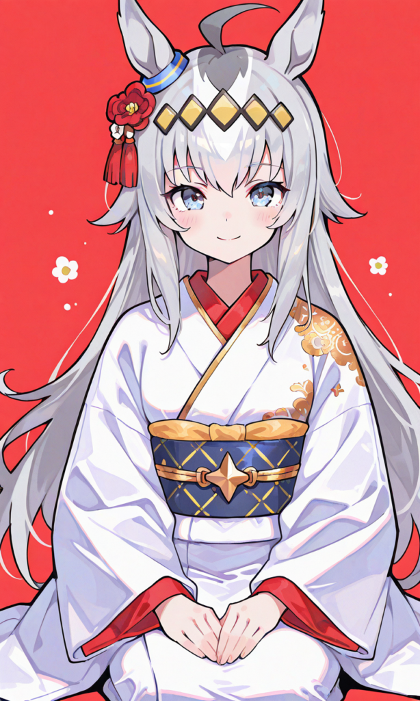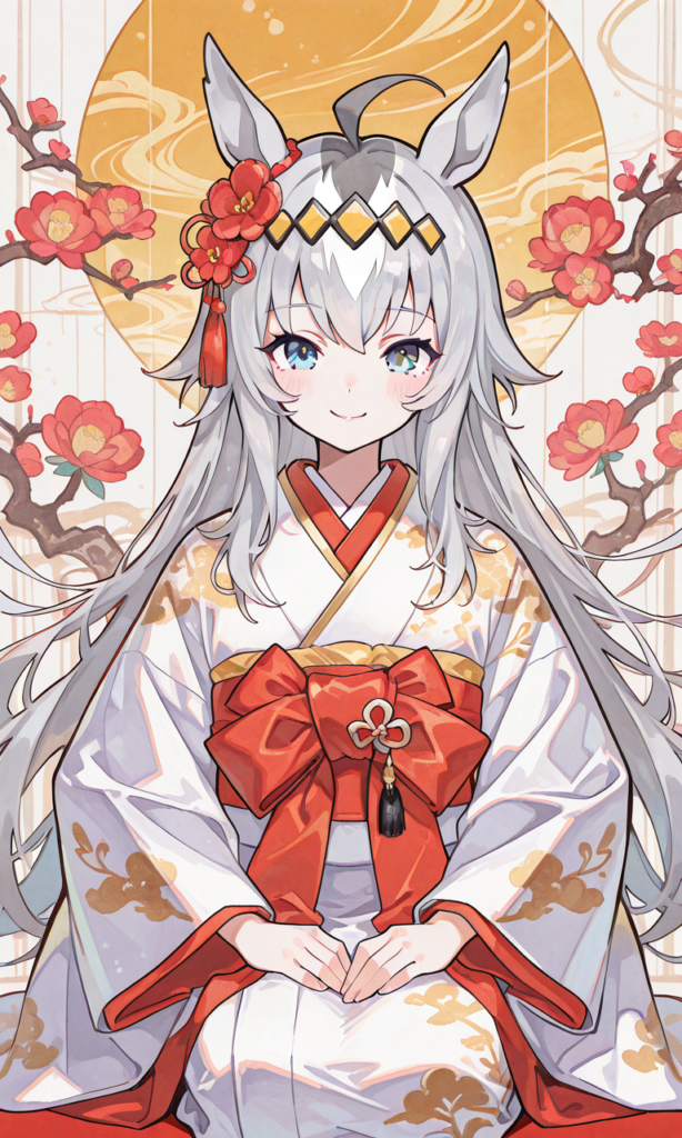 PixAI【Shiitake-Mix】oguri cap (umamusume), 1girl, white kimono, gold embroidery, seiza, straight-on, smile, cowboy shot, simple background, plum blossoms background, first sunrise, masterpiece, high quality, high resolution, neon pop art style, ♡masterpiece, highest quality, ♡