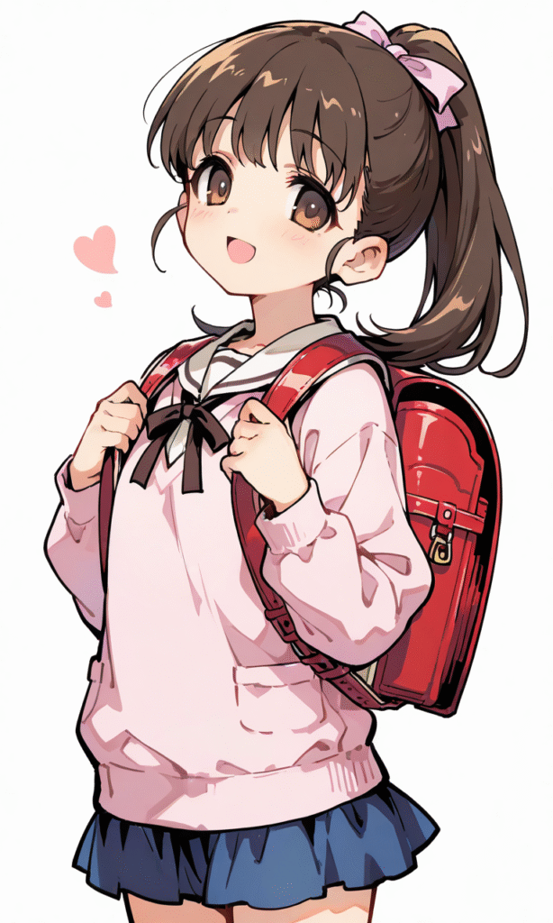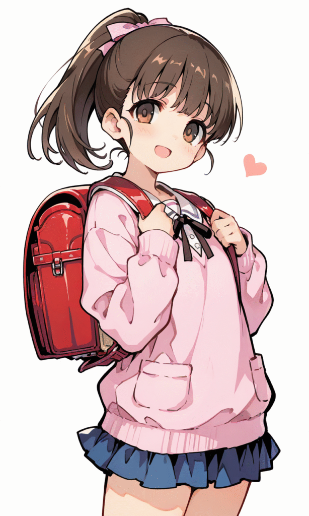 fukuyama mai, brown eyes,ponytail, tareme,smile,open mouth,randoseru, cowboy shot,simplebackground,white background, masterpiece,high quality,