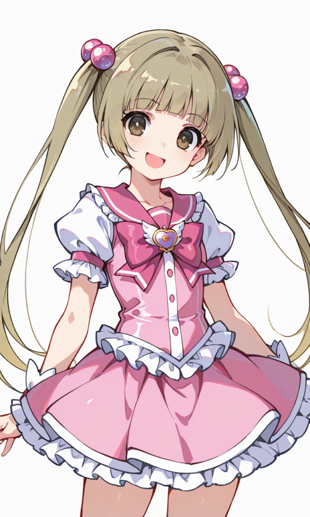yokoyama chika,hair bobbles,blunt bangs,magical girl, smile,open mouth, cowboy shot,simplebackground,white background, masterpiece,high quality,