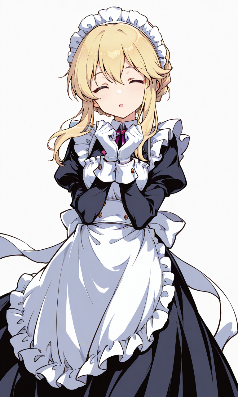 PixAI【Shiitake-Mix】clarice (idolmaster), closed eyes,open mouth,maid,long skirt, white gloves, looking at viewer, cowboy shot,simplebackground,white background, masterpiece,high quality,