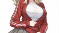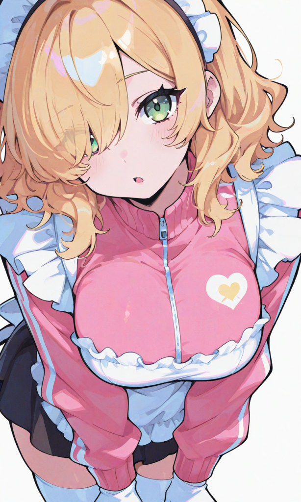 girl,blonde hair, medium hair, wavy hair,hair over one eye,open mouth, green eyes,large breast, pink track suit, maid apron,Black miniskirt,white thighhighs, white gloves, looking at viewer, leaning forward, breast focus,cowboy shot,simplebackground,masterpiece,high quality, high resolution,high-res,♡masterpiece, highest quality, ♡,neon pop art style