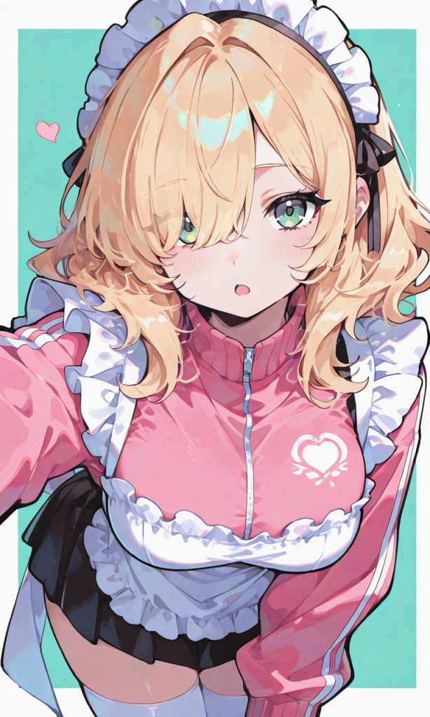 PixAI【Shiitake-Mix】girl,blonde hair, medium hair, wavy hair,hair over one eye,open mouth, green eyes,large breast, pink track suit, maid apron,maid headdress, Black miniskirt,white thighhighs, looking at viewer, leaning forward, breast focus,cowboy shot,simplebackground,masterpiece,high quality, high resolution,high-res,♡masterpiece, highest quality, ♡,neon pop art style,