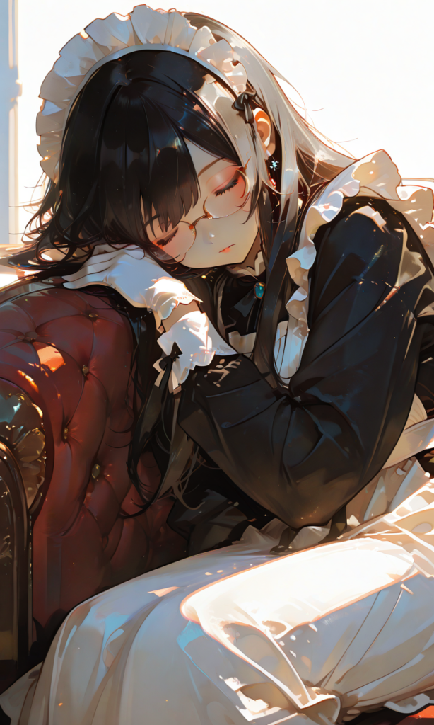 ((film grain)),1girl,black hair,long hair,straight hair,closed eyes, maid,long skirt,maid headdress, white gloves, long sleeves, glasses,cowboy shot,sitting, sofa,sleeping, simplebackground,white background, masterpiece,high quality, high resolution,high-res,748cmstyle,hyper-detailed, high contrast, depth of field, ray tracing, best lighting, cinematic composition, beautiful face, beautiful eyes, sharp focus, (masterpiece:1.2), (best quality:1.2), (very aesthetic:1.2), (absurdres:1.2), (detailed background),♡masterpiece, highest quality, ♡,