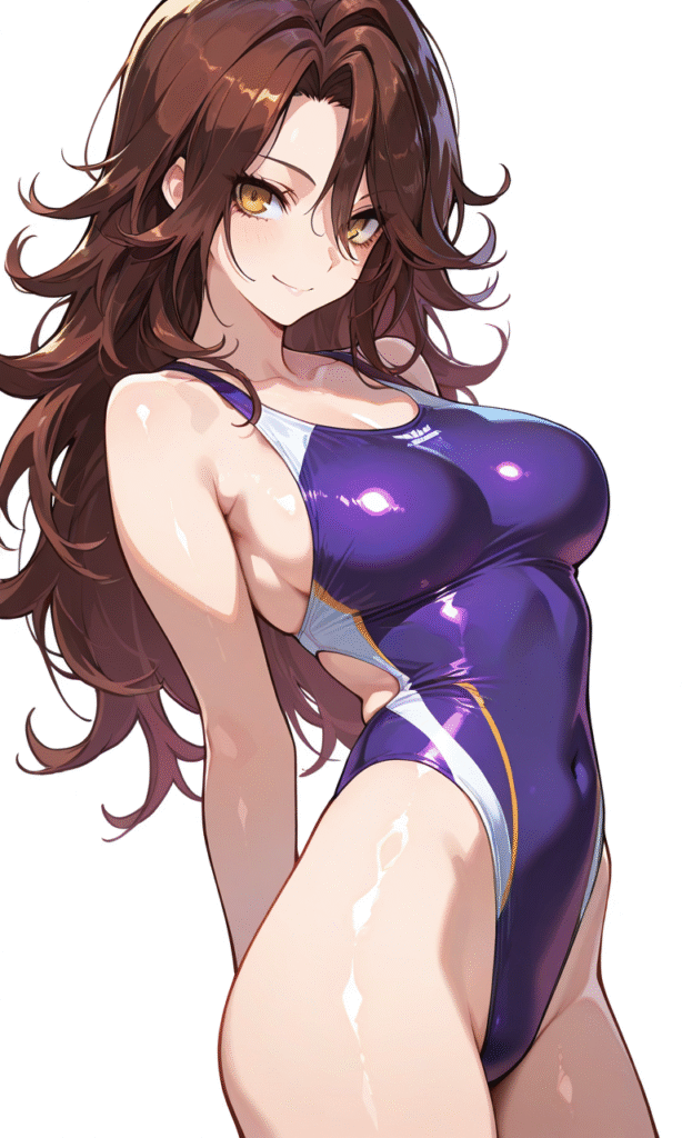 PixAI【Shiitake-Mix】sumeragi lee noriega,yellow eyes, smile,medium breast,purple highleg swimsuit,cowboy shot,simplebackground,white background, masterpiece,high quality, ,shiny skin, shiny,tokiame