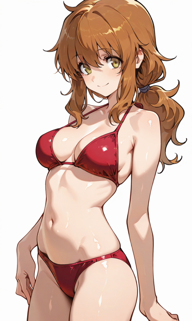 Christina Sierra,low ponytail, smile,red bikini,medium breast,cowboy shot,simplebackground,white background, masterpiece,high quality, ,shiny skin, shiny,tokiame