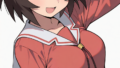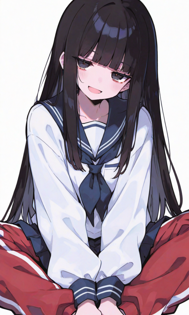 PixAI【Shiitake-Mix】1girl, long hair, black hair, straight hair, blunt bangs, jitome, serafuku, long sleeves, miniskirt, wearing track pants under skirt, looking at viewer, smile, open mouth, cowboy shot, indian style, simple background, white background, from above, masterpiece, high quality, high resolution, high-res, 748cmstyle, neon pop art style, Shining Style Art, masterpiece, best quality, very aesthetic, highres, absurdres