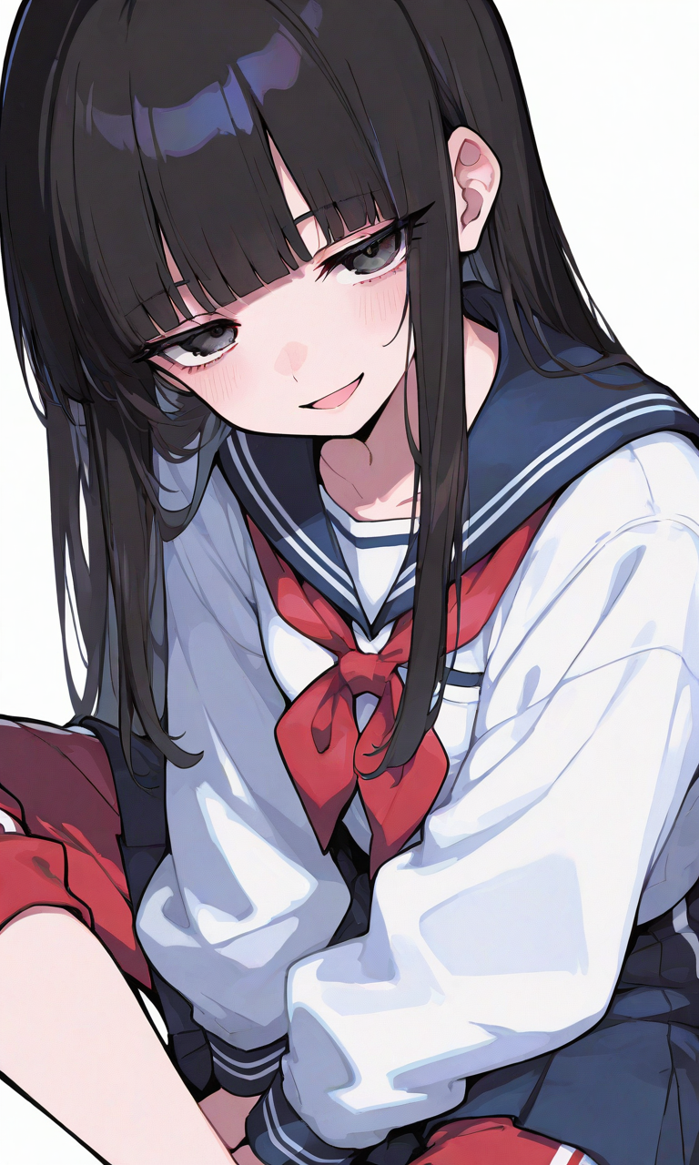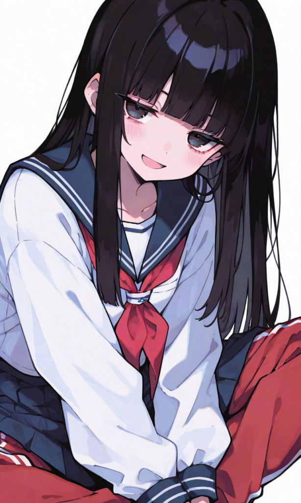 1girl, solo, long hair, black hair, straight hair, blunt bangs, jitome, serafuku, long sleeves, miniskirt, wearing track pants under skirt, red track pants, looking at viewer, grin, cowboy shot, simple background, white background, standing, masterpiece, high quality, high resolution, high-res, neon pop art style, hyper-detailed, high contrast, depth of field, ray tracing, best lighting, cinematic composition, beautiful face, beautiful eyes, sharp focus, (masterpiece:1.2), (best quality:1.2), (very aesthetic:1.2), (absurdres:1.2), (detailed background)