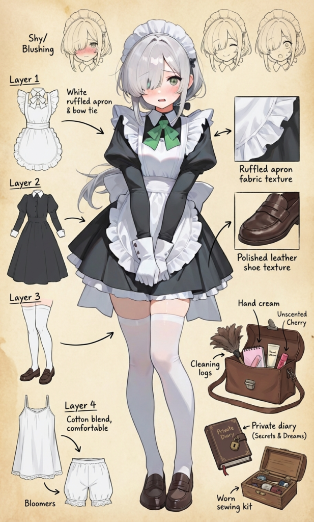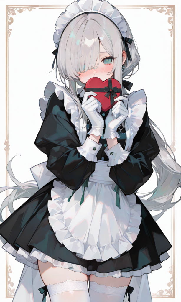 girl,silver hair, low ponytail, hair over one eye,green eyes, looking at viewer, shy,maid,maid headdress, white gloves, white thighhighs, cowboy shot,holding Valentine’s,wrapping present,standing, masterpiece,high quality, high resolution,high-res,♡masterpiece, highest quality, ♡,748cmstyle,