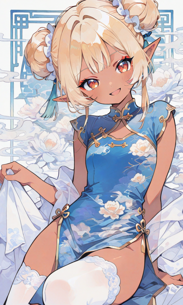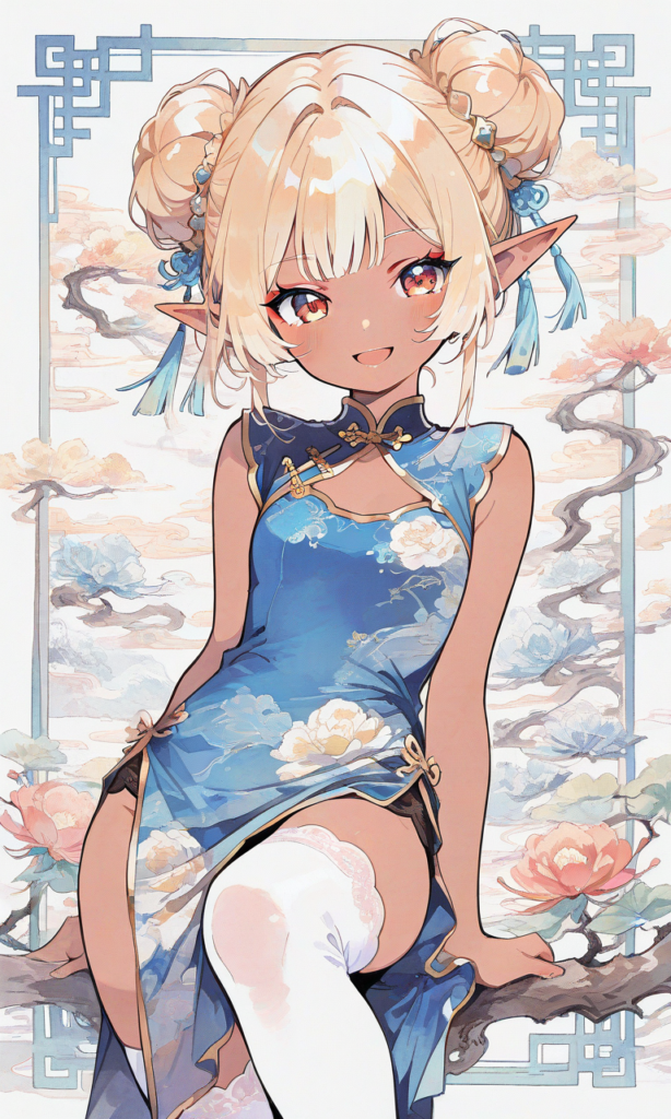 PixAI【Shiitake-Mix】little girl,dark elf, solo, blond hair, double bun, blue china dress,sleeveless,flower print,gold trim, white thighhighs, smile,open mouth,knee up, cowboy shot,masterpiece,high quality, high resolution,Chinese pattern background, minimalism, high-res,neon pop art style,(watercolor_(medium):1.2)(simple coloring,flat color:2)dutch angle,♡masterpiece, highest quality, ♡