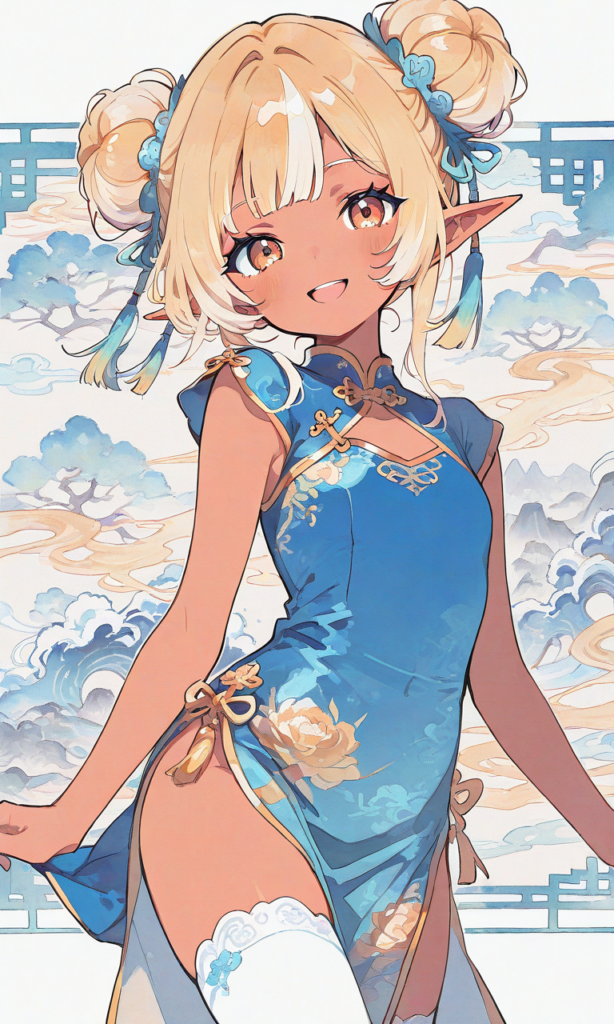 little girl,dark elf, solo, blond hair, double bun, blue china dress,sleeveless, white thighhighs, smile,open mouth, cowboy shot,masterpiece,high quality, high resolution,Chinese pattern background, minimalism, high-res,neon pop art style,(watercolor_(medium):1.2)(simple coloring,flat color:2)dutch angle,♡masterpiece, highest quality, ♡