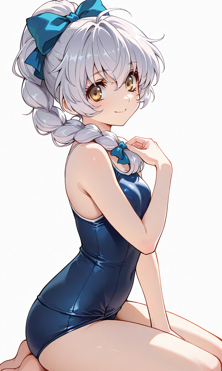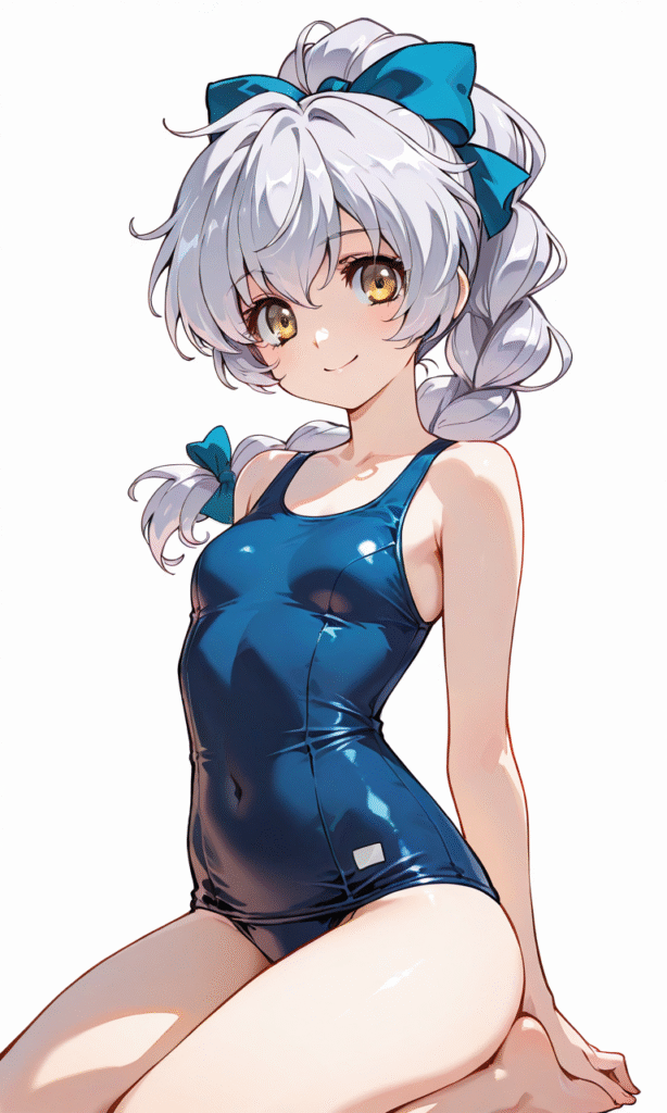 PixAI【Shiitake-Mix】Teletha Testarossa(fullmetal panic),yellow eyes, school swimsuit,,smile,seiza,looking at viewer, small breast,cowboy shot,simplebackground,white background, masterpiece,high quality, ,tokiame