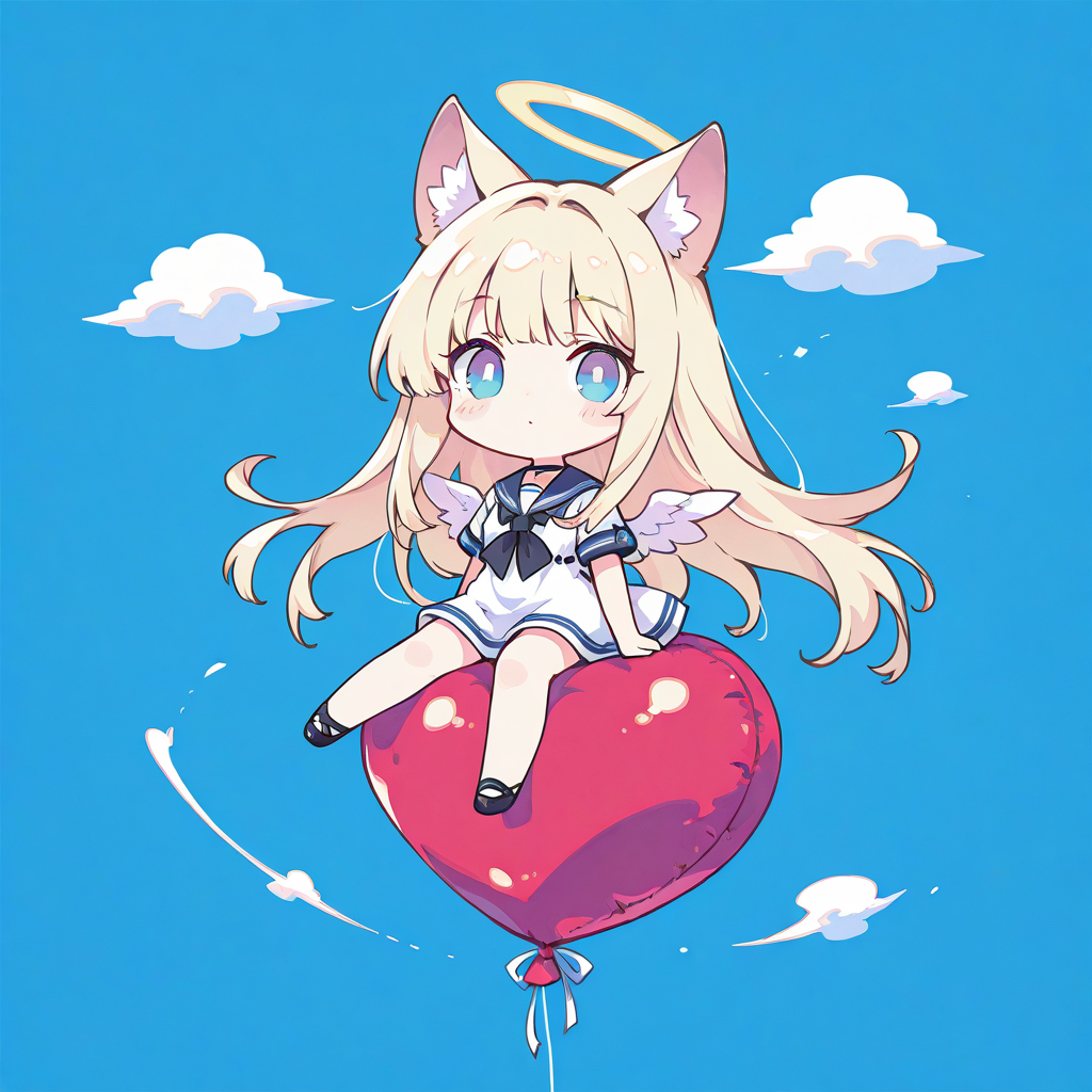 1girl, solo, blonde hair, long hair, straight hair, cat ears, looking at viewer, full body, halo, little wings, sitting on heart balloon, floating air, flying sky, cloud, masterpiece, simple background, blue background, high quality, sailor dress, short sleeves, high resolution, tokiame, chibi, big head, small body, large eyes, blush, simple lines, bright colors, simple colors, cute
