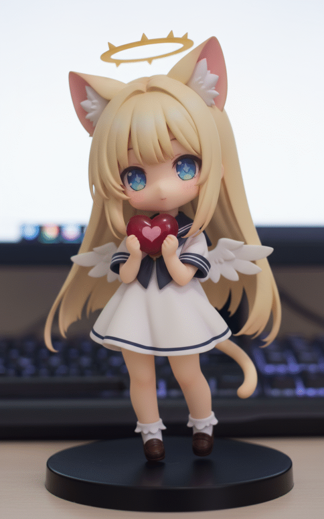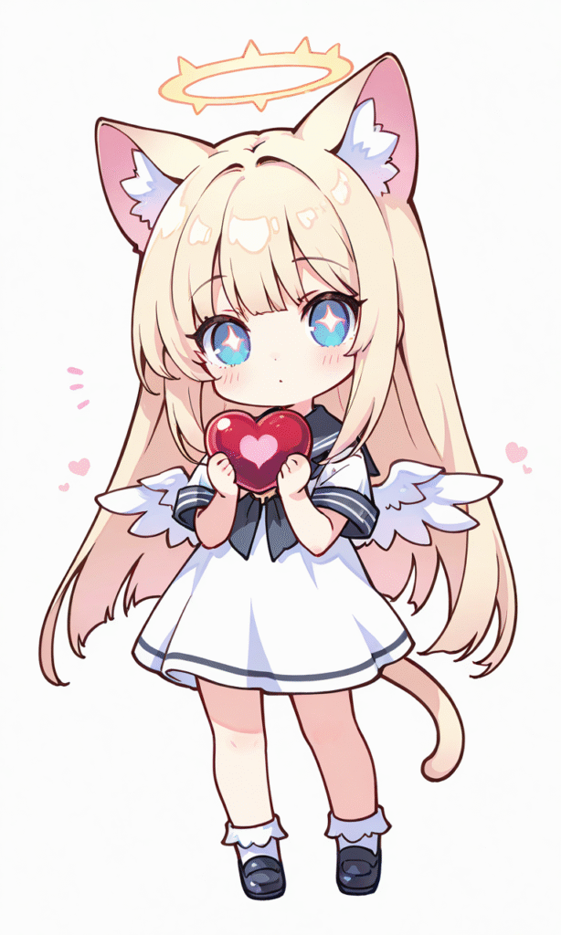 1girl, solo, blonde hair, long hair, straight hair, cat ears, looking at viewer, full body, halo, little wings, holding heart (organ), symbol, masterpiece, simple background, white background, high quality, sailor dress, short sleeves, high resolution, tokiame, chibi, big head, small body, large eyes, blush, simple lines, bright colors, simple colors, cute