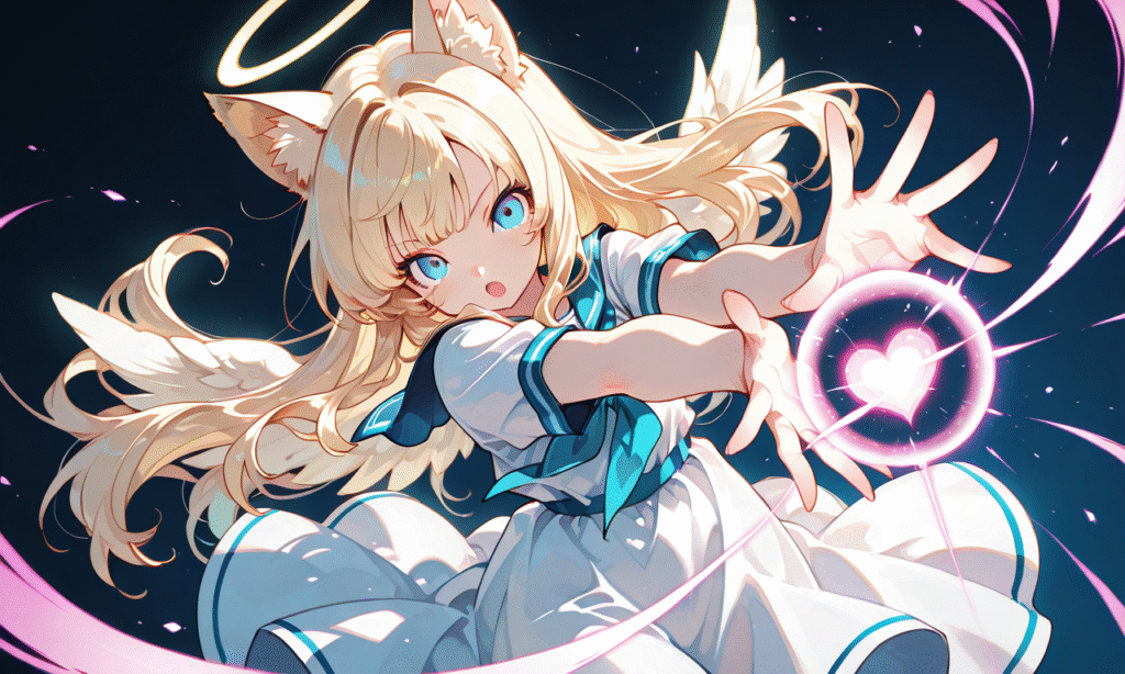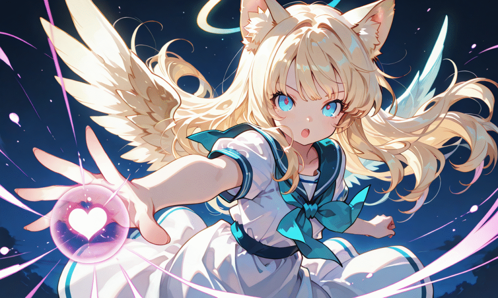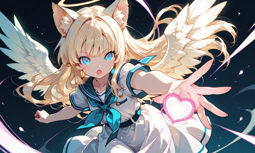 1girl, solo, blonde hair, long hair, straight hair, blue eyes, cat ears, halo, little wings, open mouth, kamehameha (dragon ball), heart energy ball, heart-shaped beam, incoming attack, emitting from hand, looking at viewer, cowboy shot, simple background, masterpiece, high quality, sailor dress, short sleeves, high resolution, tokiame, hyper-detailed, high contrast, depth of field, ray tracing, best lighting, cinematic composition, beautiful face, beautiful eyes, sharp focus, (masterpiece:1.2), (best quality:1.2), (very aesthetic:1.2), (absurdres:1.2), (detailed background), cinematic lighting, cinematic angle, soft light, color detail, backlighting, Depth of field, long exposure, light steps, intricate colors, vibrant colors, (detailed_hands:1.5)