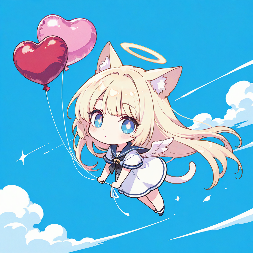 PixAI【Shiitake-Mix】1girl, solo, blonde hair, long hair, straight hair, cat ears, looking at viewer, full body, halo, little wings, hanging heart balloon, floating air, flying sky, cloud, masterpiece, simple background, blue background, high quality, sailor dress, short sleeves, high resolution, tokiame, chibi, big head, small body, large eyes, blush, simple lines, bright colors, simple colors, cute