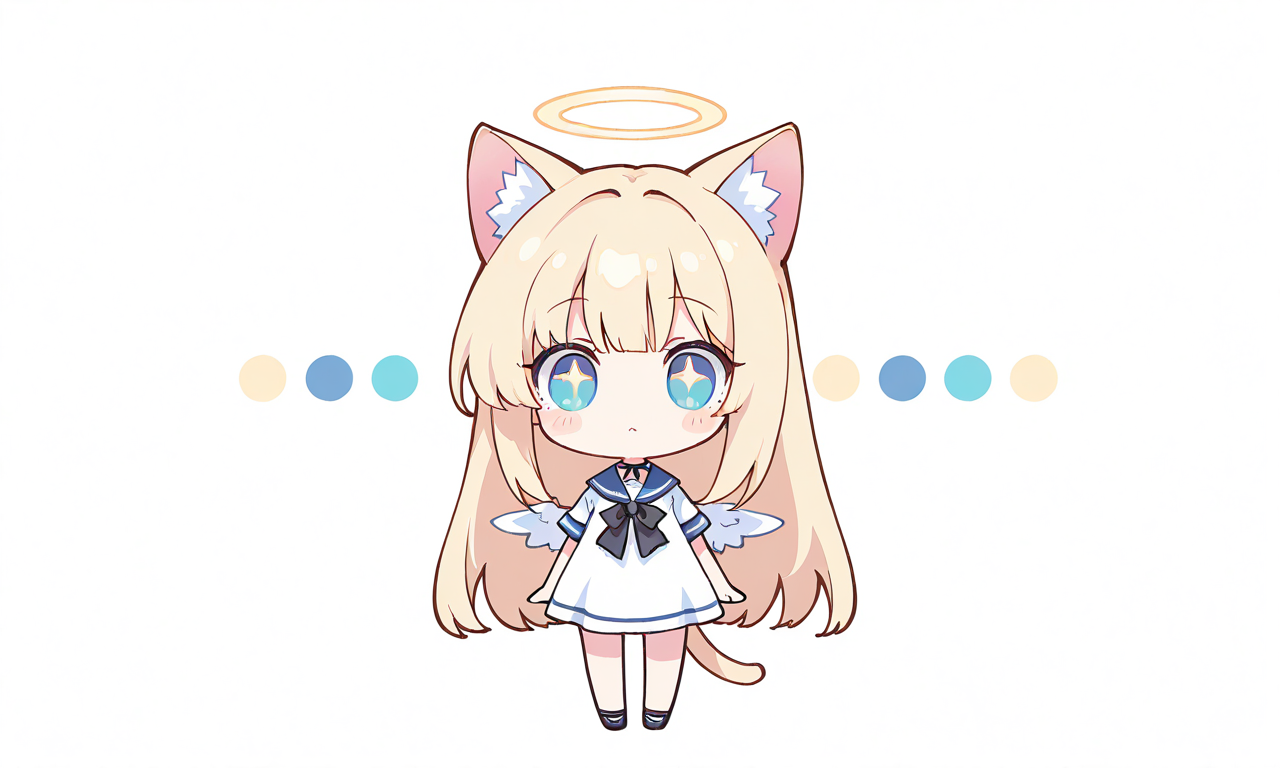 1girl, solo, blonde hair, long hair, straight hair, cat ears, halo, little wings, full body, straight-on, masterpiece, simple background, white background, high quality, sailor dress, short sleeves, high resolution, tokiame, chibi, big head, small body, large eyes, blush, simple lines, bright colors, simple colors, cute