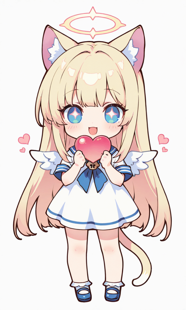 PixAI【Shiitake-Mix】1girl, solo, blonde hair, long hair, straight hair, cat ears, halo, little wings, blowing a kiss, heart, cowboy shot, masterpiece, simple background, white background, high quality, sailor dress, short sleeves, high resolution, tokiame, chibi, big head, small body, large eyes, blush, simple lines, bright colors, simple colors, cute