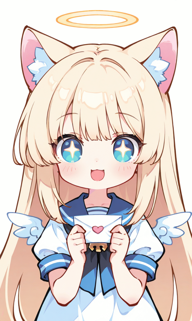 1girl, solo, blonde hair, long hair, straight hair, cat ears, halo, little wings, upper body, straight-on, holding love letter, smile, open mouth, masterpiece, simple background, white background, high quality, sailor dress, short sleeves, high resolution, tokiame, chibi, big head, small body, large eyes, blush, simple lines, bright colors, simple colors, cute