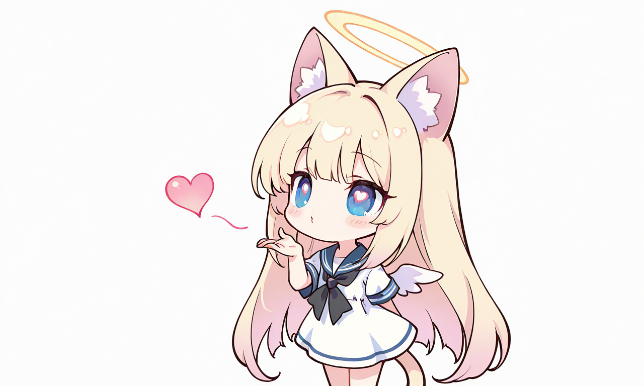 PixAI【Shiitake-Mix】1girl, solo, blonde hair, long hair, straight hair, cat ears, halo, little wings, blowing a kiss, heart, cowboy shot, masterpiece, simple background, white background, high quality, sailor dress, short sleeves, high resolution, tokiame, chibi, big head, small body, large eyes, blush, simple lines, bright colors, simple colors, cute