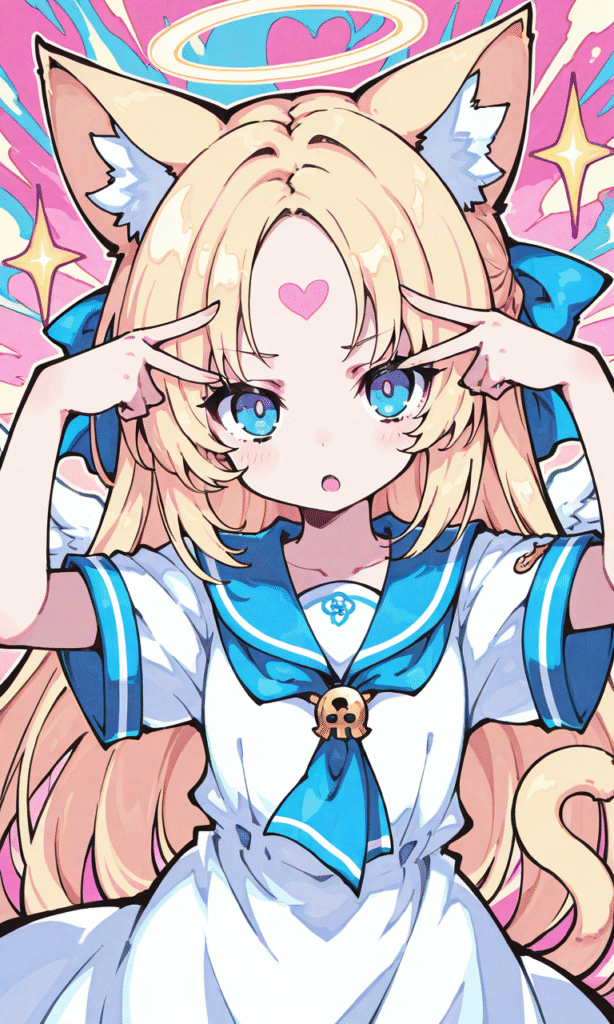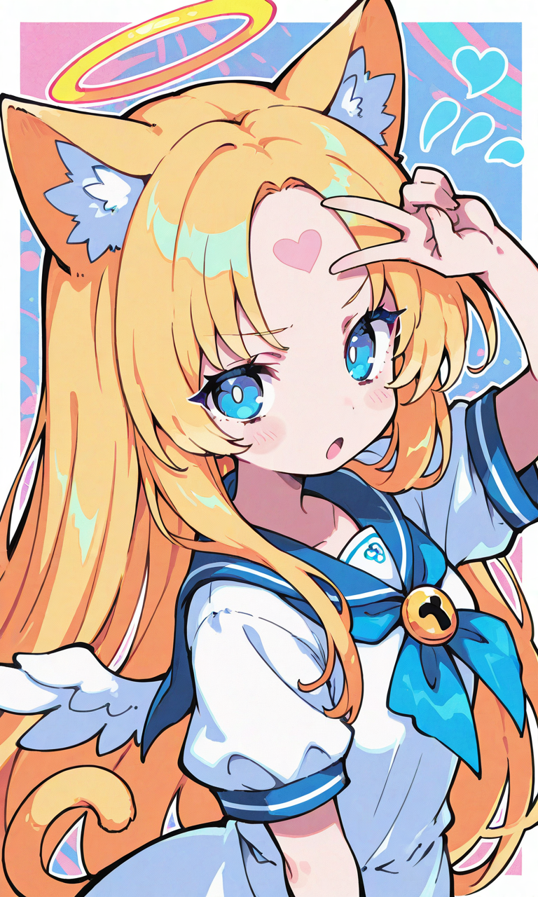 PixAI【Shiitake-Mix】1girl,solo, blonde hair, long hair,straight hair, blue eyes,cat ears,cat Tail, halo, little wings,sailor dress, short sleeves,heart-shaped forehead,serious, open mouth, hand_on_own_forehead,v,upper body, masterpiece,high quality,high resolution