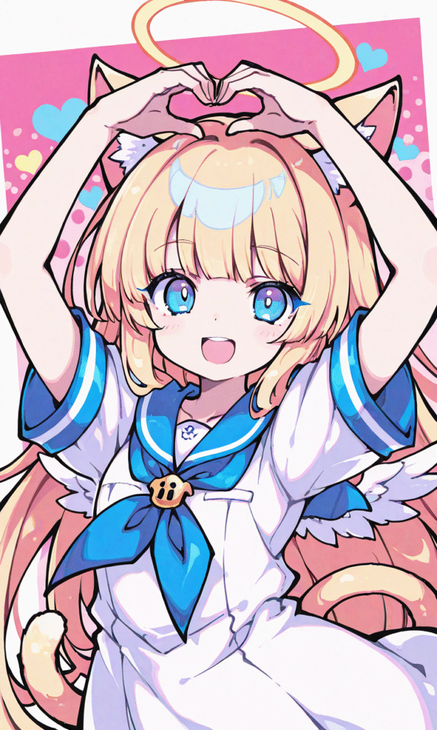 1girl,solo, blonde hair, long hair,straight hair, blue eyes,cat ears,cat Tail, halo, little wings,sailor dress, short sleeves,heart arms, smile, open mouth, ,upper body, masterpiece,high quality,high resolution