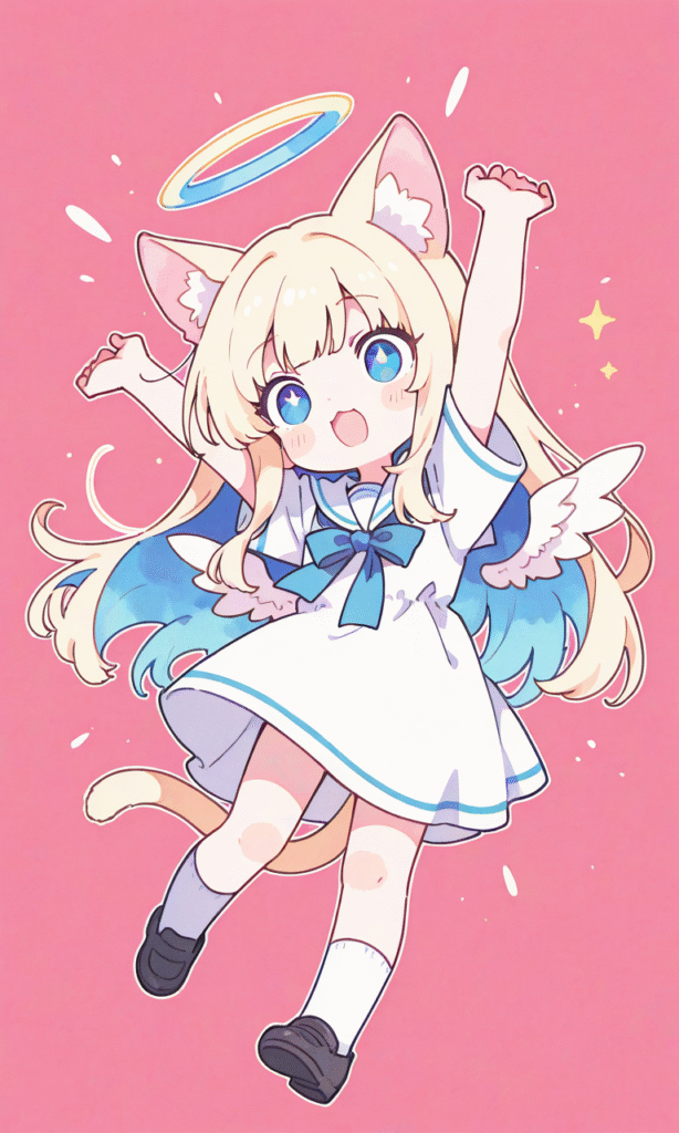 1girl,solo, blonde hair, long hair,straight hair, blue eyes,cat ears,cat Tail, halo, little wings,sailor dress, short sleeves,arms up,surprised, open mouth, ,full body, masterpiece,high quality,high resolution