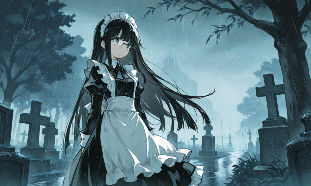 PixAI【Shiitake-Mix】monochrome,girl,black hair,long hair,straight hair,maid,glasses,cowboy shot,cemetery,rain,looking away,((4k,8k,Ultra HD)),((Masterpiece :1.2)),((Best quality :1.2)),((Detailed :1.5)),((Detailed background :1.5)),Male, detailed_eyes, xiaohongshu style,