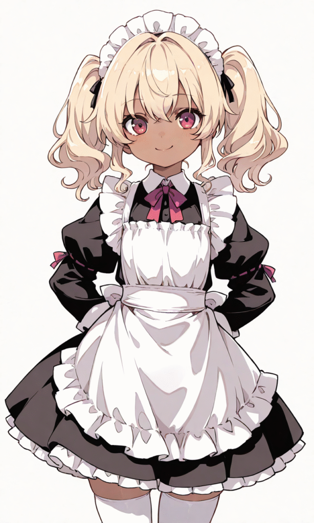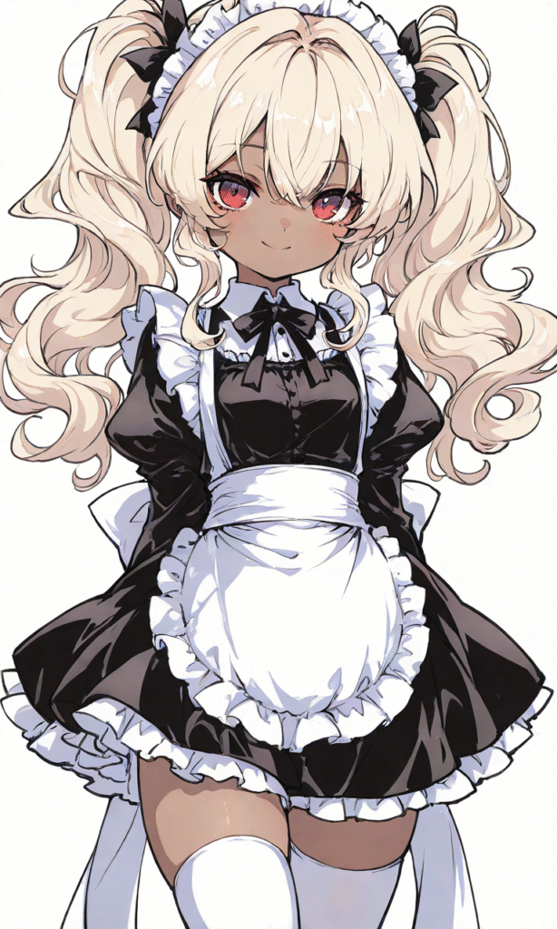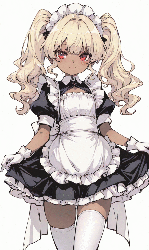 little girl,blonde hair, twintail,wavy hair, dark skin,red eyes, maid,white thighhighs, cowboy shot,smile,simplebackground,white background, masterpiece,high quality, ,tokiame,Beautiful eyes,detailed,soft colors