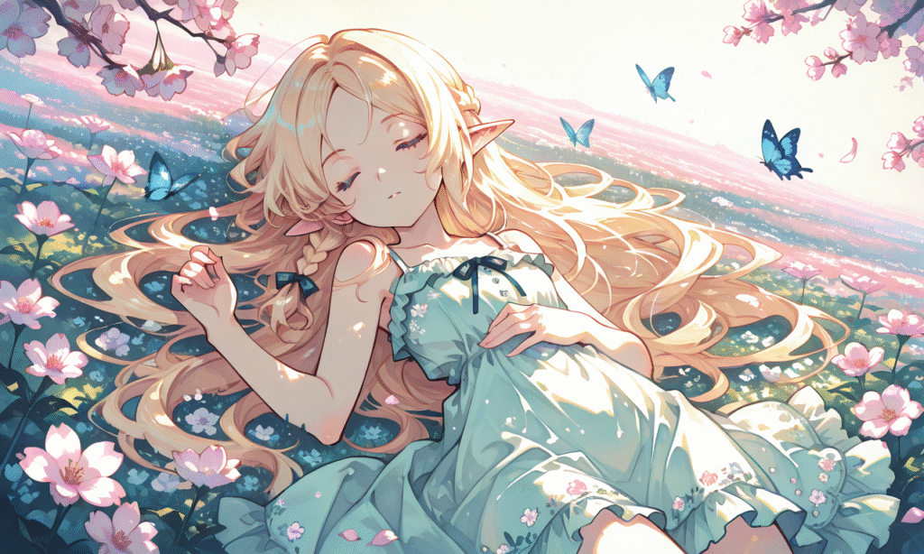 1girl, elf, solo, blonde hair, long hair, parted bangs, closed eyes, flat chest, lying, cowboy shot, flowing pastel sundress, cherry blossom petals, frilled dress, flower field, sheer layers, floral embroidery, delicate ribbons, braided hair, tiny blossoms, butterflies, ethereal, romantic, springtime, masterpiece, high quality, hyper-detailed, high contrast, depth of field, ray tracing, best lighting, cinematic composition, beautiful face, beautiful eyes, sharp focus, detailed background, tokiame, fantasy scene