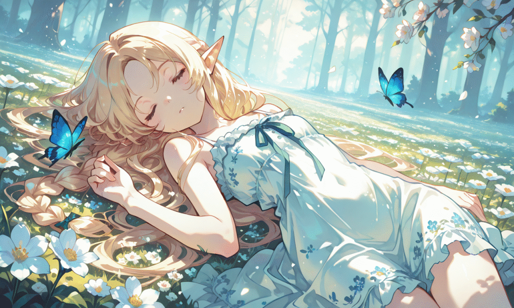 1girl, elf, solo, blonde hair, long hair, parted bangs, closed eyes, flat chest, lying, cowboy shot, flowing pastel sundress, frilled dress, flower field, sheer layers, floral embroidery, delicate ribbons, braided hair, tiny blossoms, butterflies, ethereal, romantic, springtime, masterpiece, high quality, tokiame, hyper-detailed, high contrast, depth of field, ray tracing, best lighting, cinematic composition, beautiful face, beautiful eyes, sharp focus, (masterpiece:1.2), (best quality:1.2), (very aesthetic:1.2), (absurdres:1.2), detailed background, fantasy scene