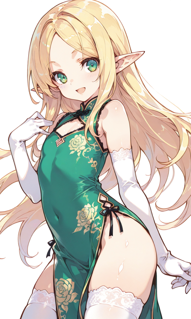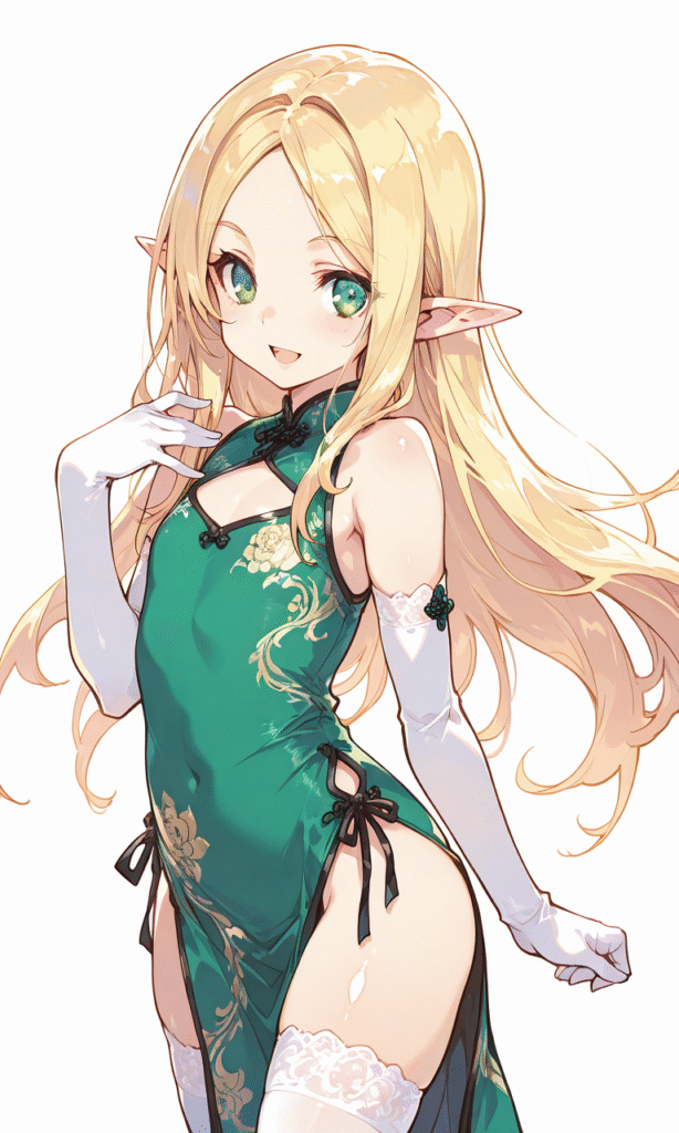 1girl, elf, solo, blonde hair, long hair, parted bangs, green eyes, flat chest, china dress (green), sleeveless, white thighhighs, elbow gloves (white), lace, smile, open mouth, cowboy shot, simple background, white background, masterpiece, high quality, high resolution, shiny skin, shiny, tokiame, fantasy scene