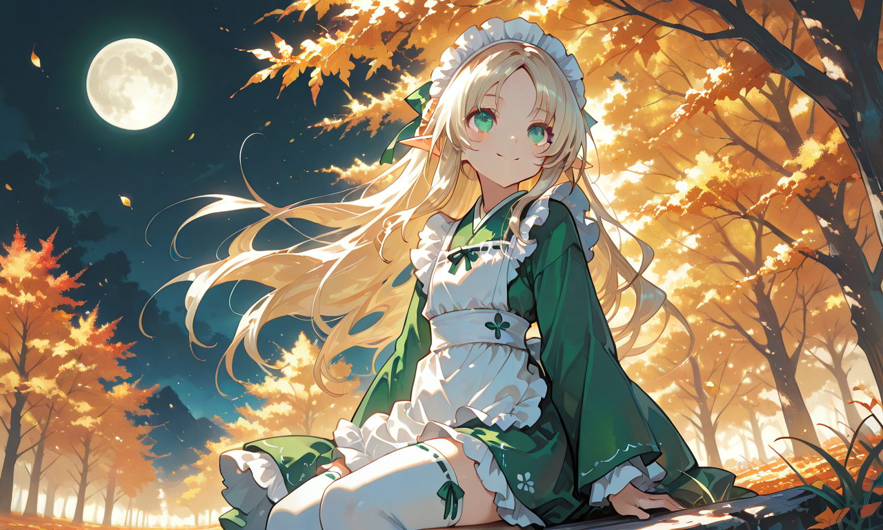 PixAI【Shiitake-Mix】girl, elf, solo, blonde hair, long hair, parted bangs, green eyes, big eyes, smile, flat chest, looking up, wa maid (green), white thighhighs, Japanese silver grass, full moon, autumn, masterpiece, high quality, hyper-detailed, high contrast, depth of field, ray tracing, best lighting, cinematic composition, beautiful face, beautiful eyes, sharp focus, (masterpiece:1.2), (best quality:1.2), (very aesthetic:1.2), (absurdres:1.2), (detailed background), tokiame, Fantasy Scene
