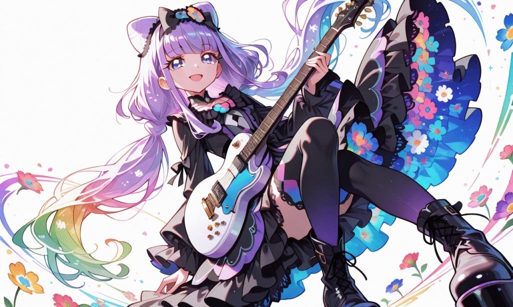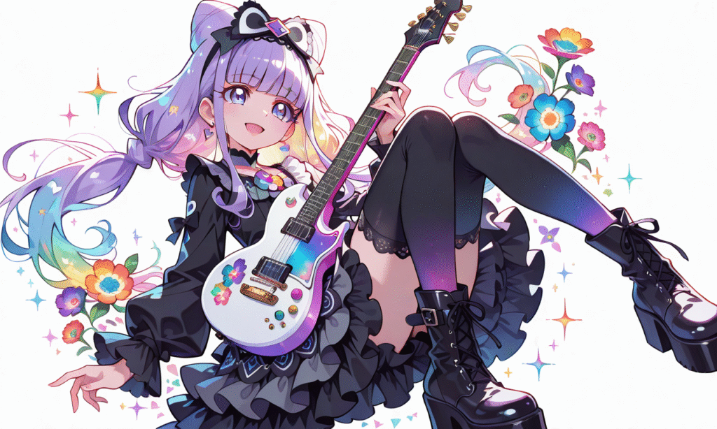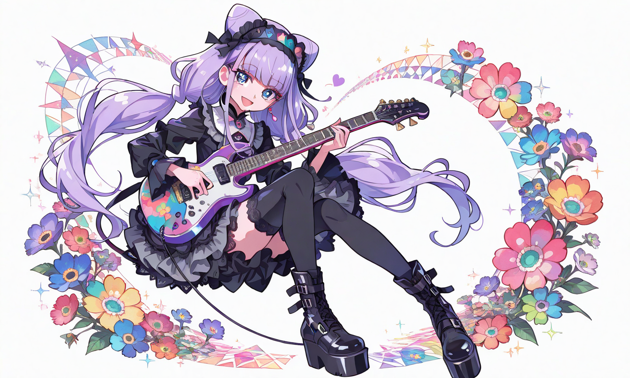 ruru amour(precure), smile,open mouth, gothic lolita,platform boots,black lace thighhighs,electric guitar,heart, masterpiece,high quality,minimalistic line logo, tessellated geometrical design, symmetrical, vectorized, white background, digital style,colored pencil, colorful flowers,cinematic lighting , cinematic angle, soft light , color detail, backlighting, Depth of field, long exposure, light steps, intricate colors, vibrant colors,